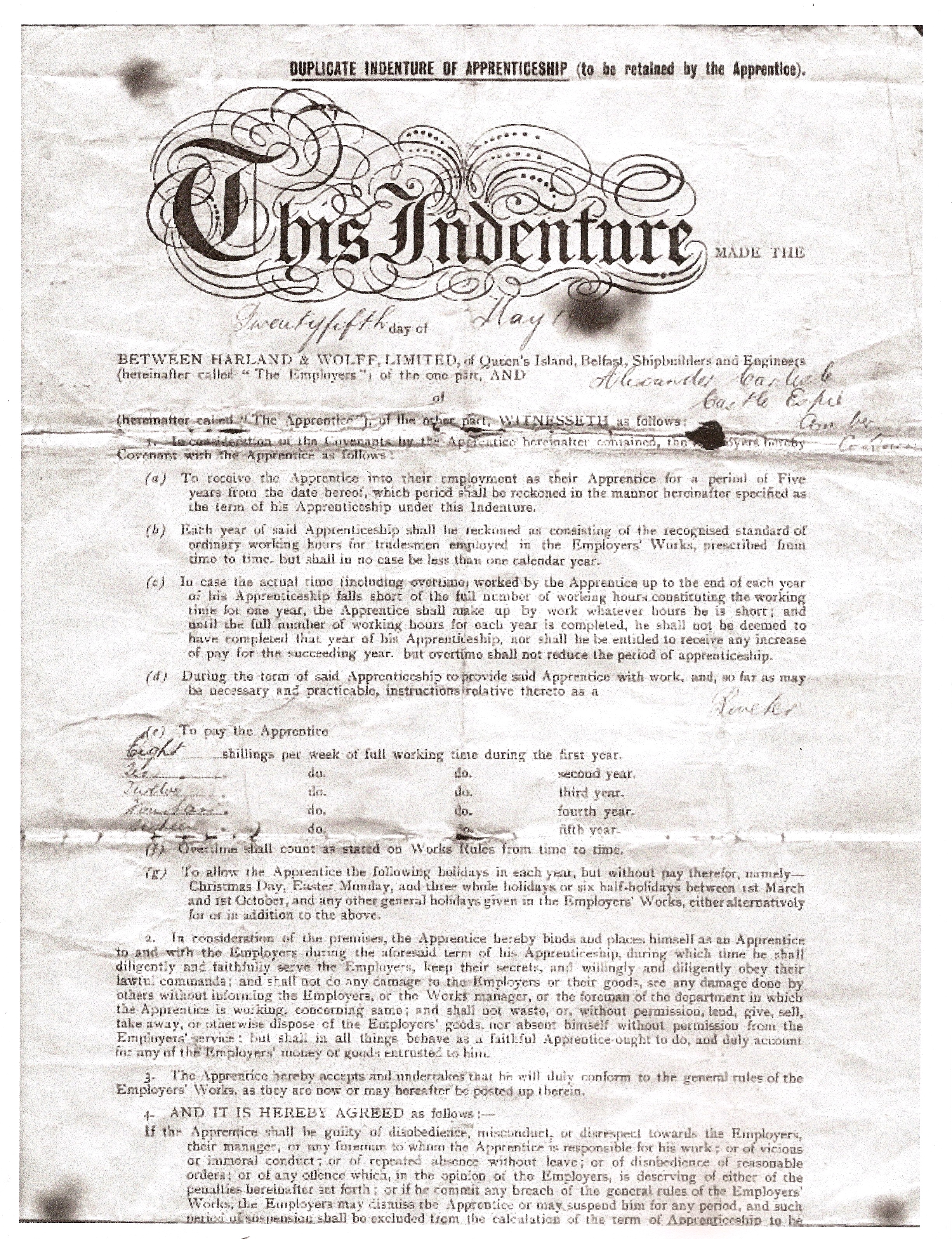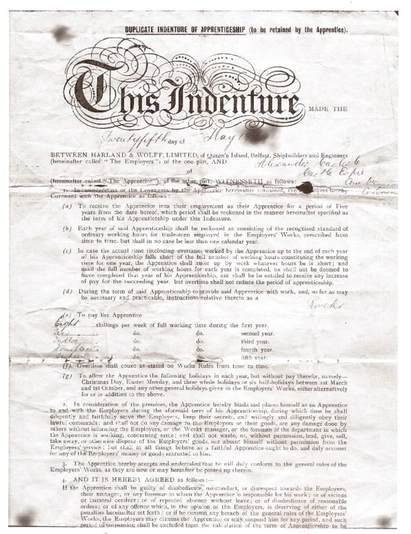 Life for a young H & W [Harland & Wolff] apprentice like Francis [Frank] Bell was both exciting and demanding in its requirements and conditions in Autumn 1911. I am unable to confirm if Frank was an ordinary or a premium apprentice at H & W, but suspect it to be the latter. Being a premium apprentice would be a ‘shipyard pupil’ whose parent i.e. Joseph Bell, Chief Engineer on the Titanic at the time, would normally make a payment to H & W and Frank would consequentially be indentured by them.
