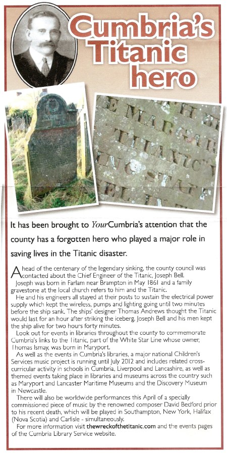 Many people in the northwest of England and nationally, will on April 15th the 100th anniversary of the sinking of the Titanic, wonder why Carlisle County Council has failed to honour in any public way over the last 100 years the Cumberland born heroic Chief Engineer of the Titanic, Joseph Bell, born 1861 in Farlam, nr Brampton. In the early 1870’s Joseph and his family moved to Stanwix, Carlisle where he continued his education.