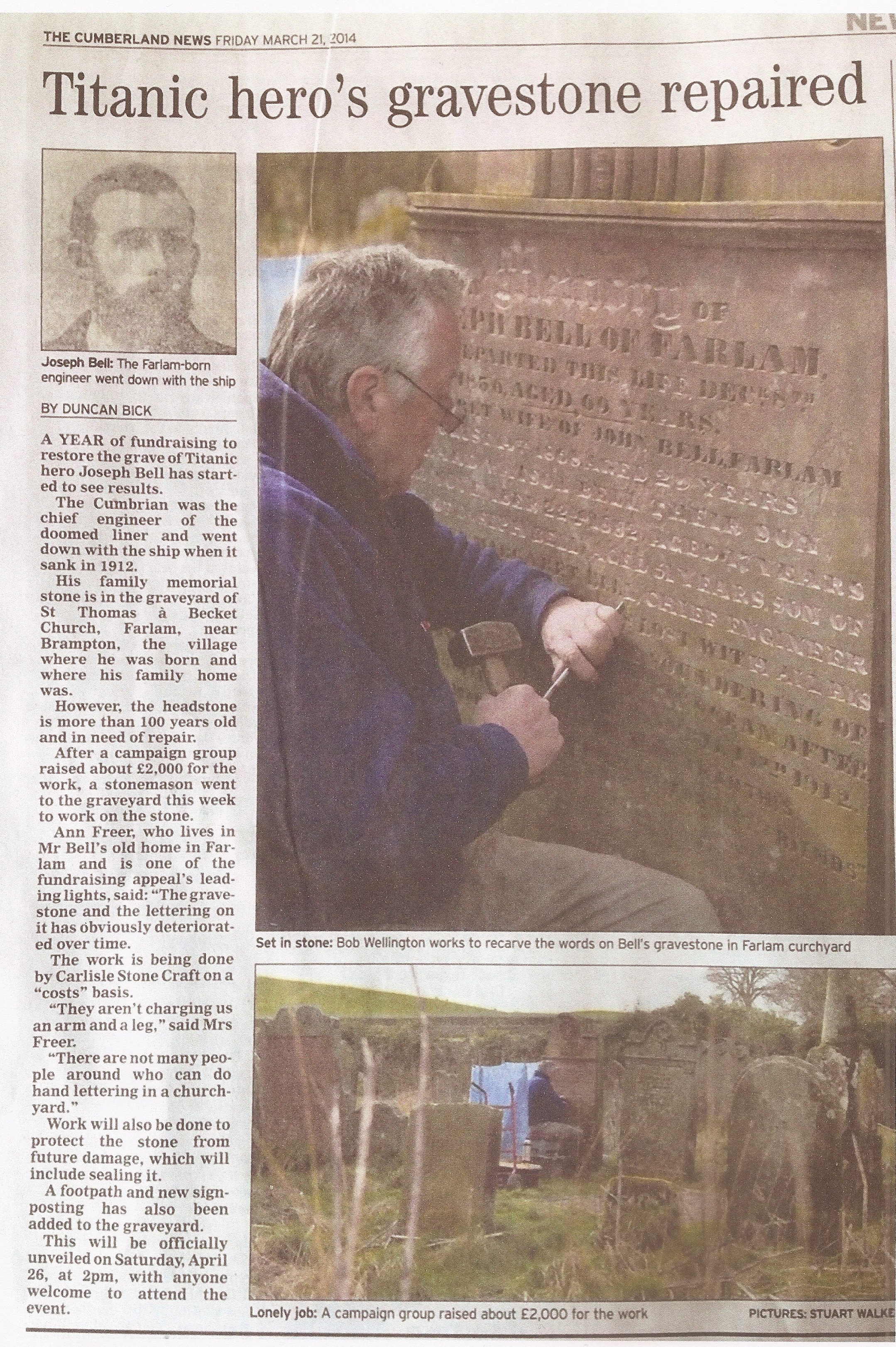 The Appeal launched in April 2013 for funds to conserve the only memorial in Cumbria to the Titanic Chief Engineer Joseph Bell, in Farlam, have enabled the conservation work  to be undertaken, with a commemoration service celebrating this to be held at the gravestone memorial, on Saturday the 26th of April, at 2.00 pm, to which all are welcome.